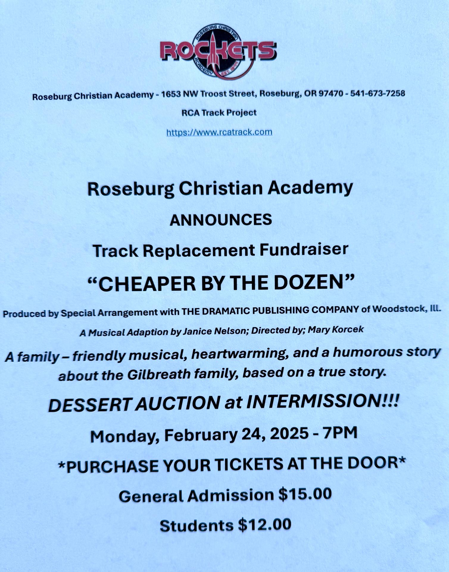 We are at it again! Don’t miss your chance to enjoy an evening of music, humor and delicious desserts all to raise funds for our new track! Come join the fun! Bring your wallet, prepare to bid on incredible desserts, and then enjoy eating them at intermission! Our students have been practicing and finely tuning this show just for you! Buy your tickets at the door! Students-$12, General Admission $15